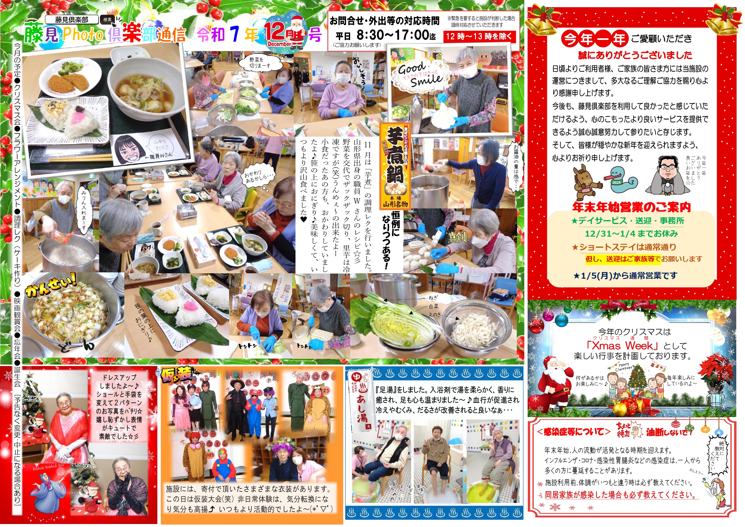 藤見Photo倶楽部通信 令和7年【12月号】 / PHOTO通信 / By ito ※クリックで拡大 藤見倶楽部では「また来たい」と思っていただける、居心地よさに満ちたサービス提供に力を入れています。 新潟市の地域社会に貢献し、誰からも愛されるデイサービス、介護施設運営を目指しています。